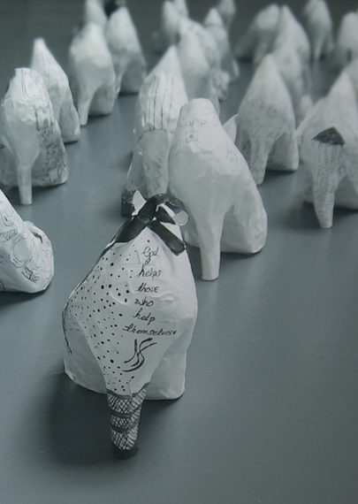 'The Little Paper Slipper' started by exploring harrowing experiences and their effects on the psyche. This involved running a number of socially conscious workshops with women who have experienced domestic abuse. The year-long project involved a 2 month nationwide tour in which women deconstructed notions of power, using the workshop as a therapeutic tool for expressing the effects of their abusive relationships. The result of this has been the physical 'Little Paper Slippers' which are on show next to some of Jones' creations.