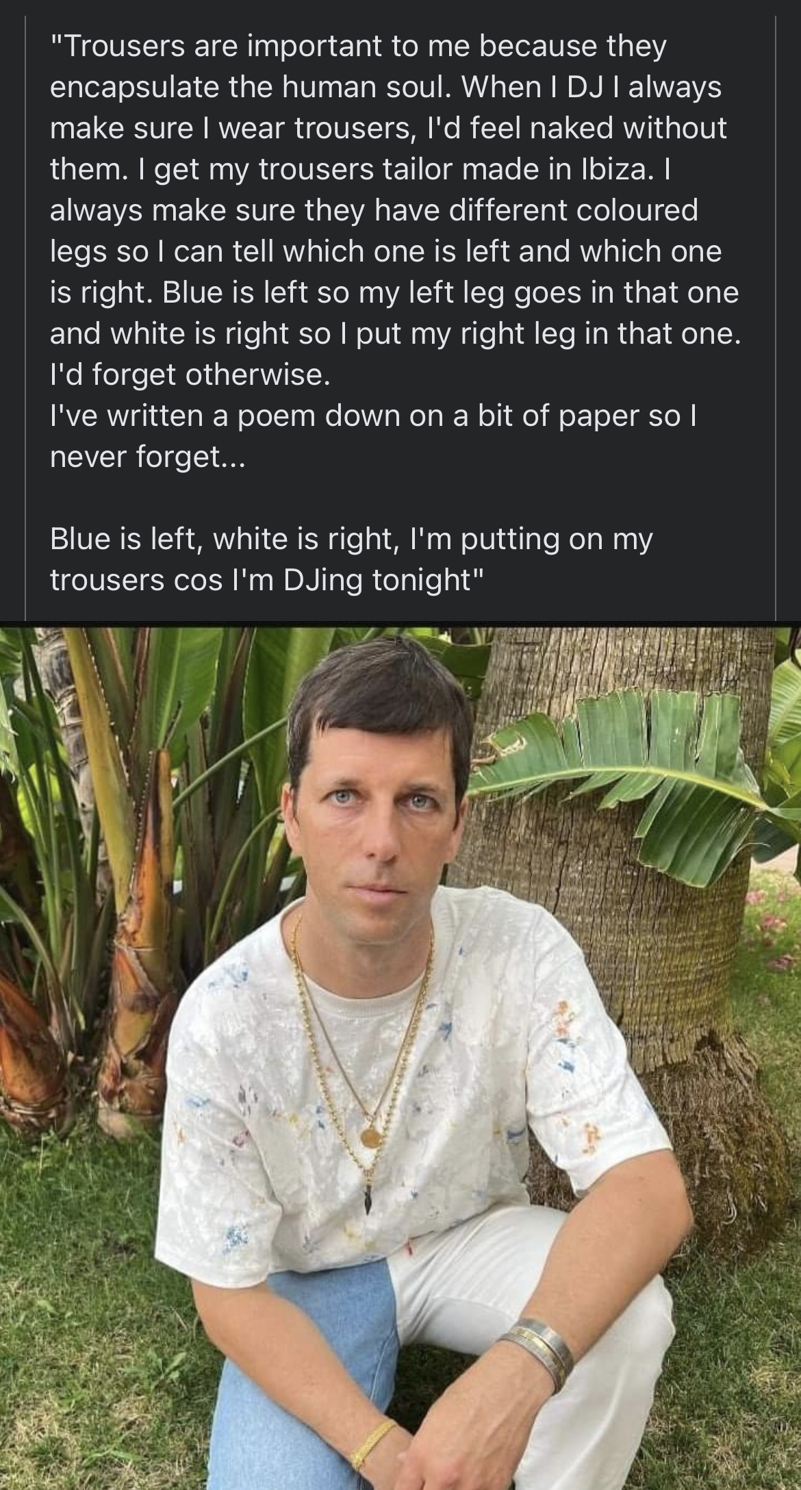 Who needs clothes? Who needs central heating? Who needs food? It’s been great getting to live a little more humbly during these strange times. They say that innovation is born from necessity, check out my new threads.