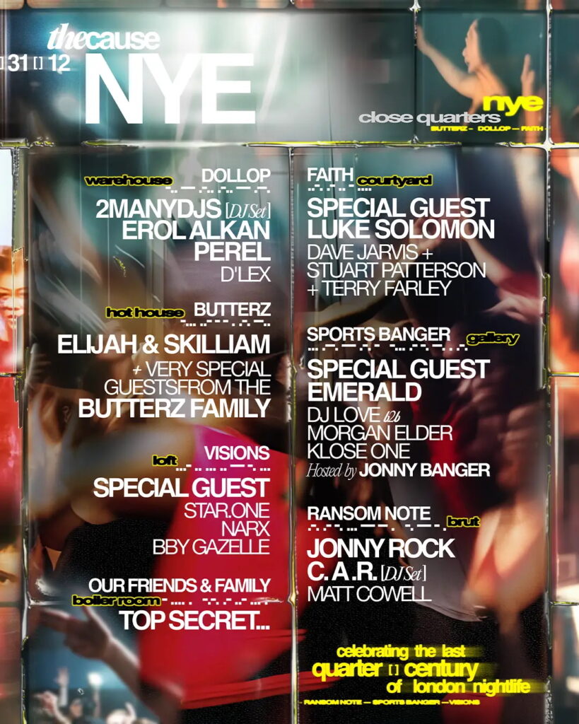For New Years Eve, The Cause have invited a selection of crews who have been involved within London’s nightlife over the last 25 years. The event sees hosts takeover 7 rooms with artists including the likes of 2manydjs, Perel, Emerald, C.A.R. and a whole load more.